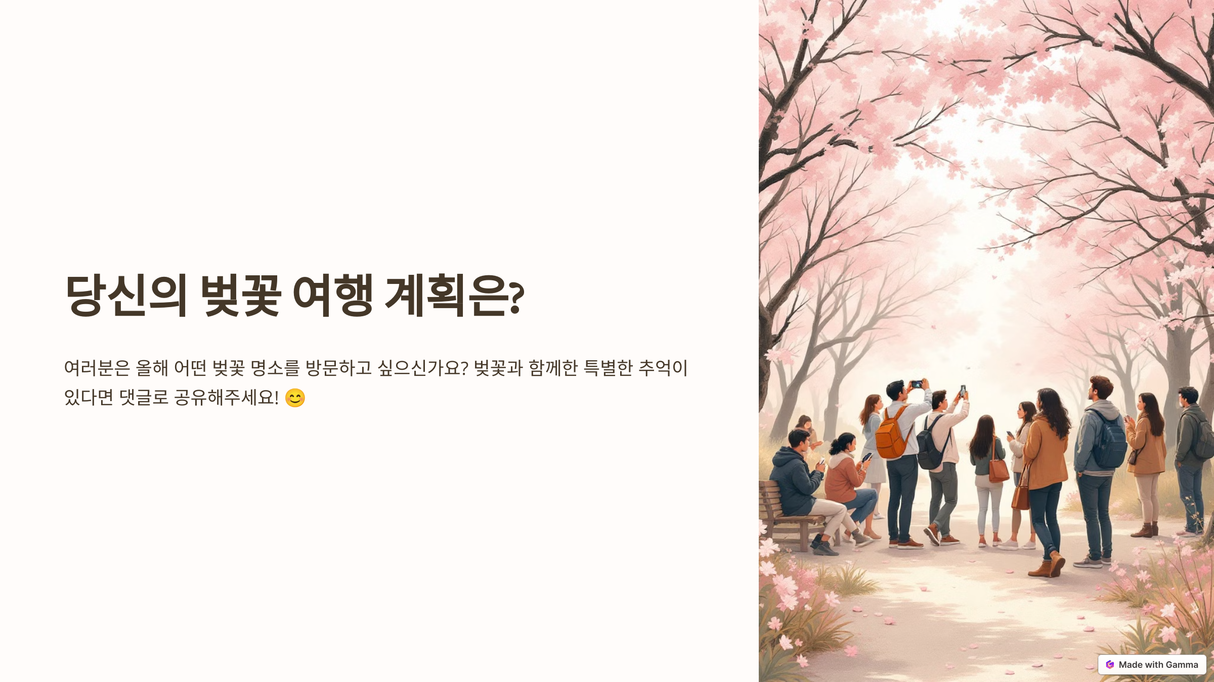여러분은 올해 어떤 벚꽃 명소를 방문하고 싶으신가요? 벚꽃과 함께한 특별한 추억이 있다면 댓글로 공유해주세요! 😊