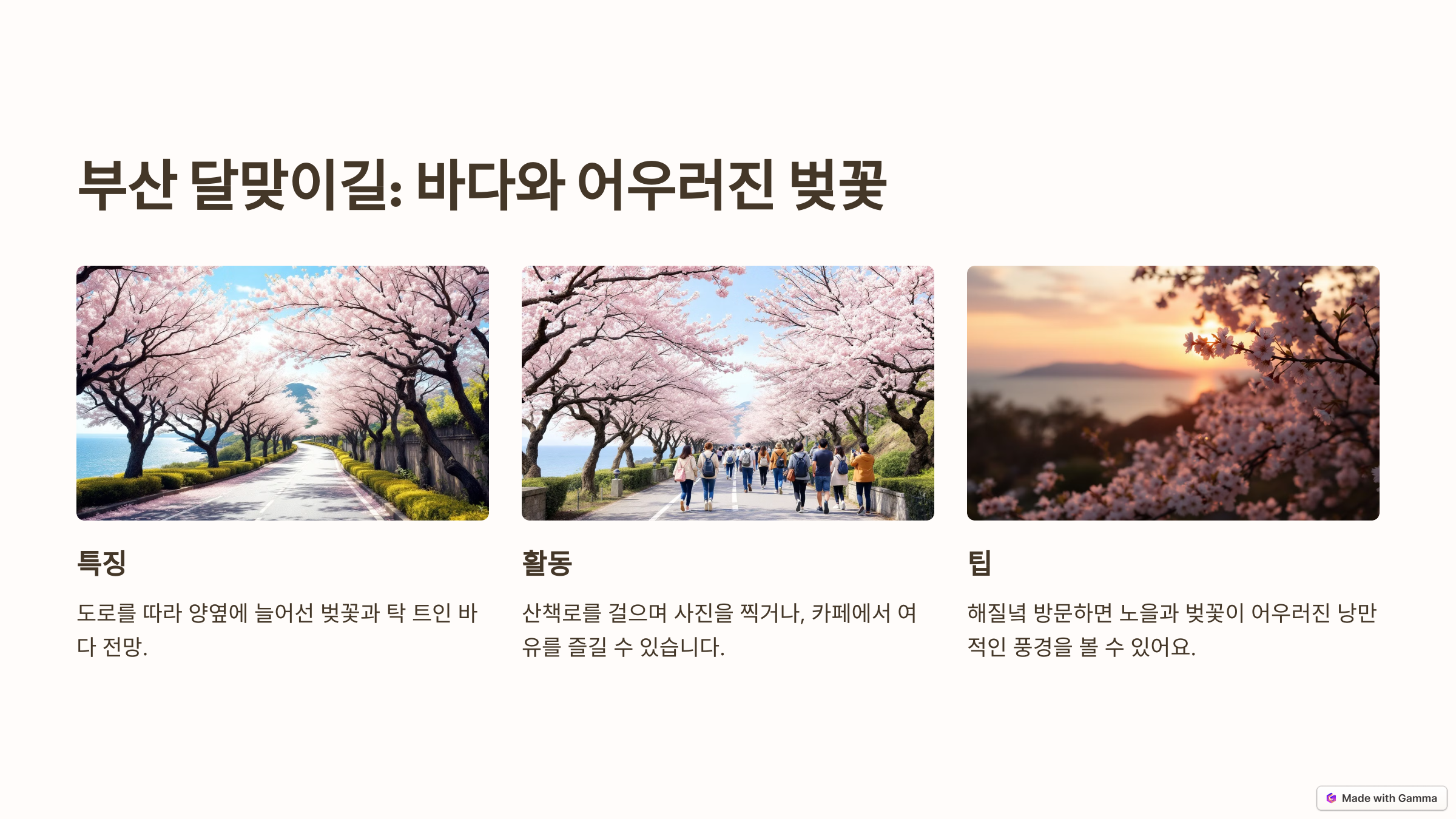 - 특징: 도로를 따라 양옆에 늘어선 벚꽃과 탁 트인 바다 전망.