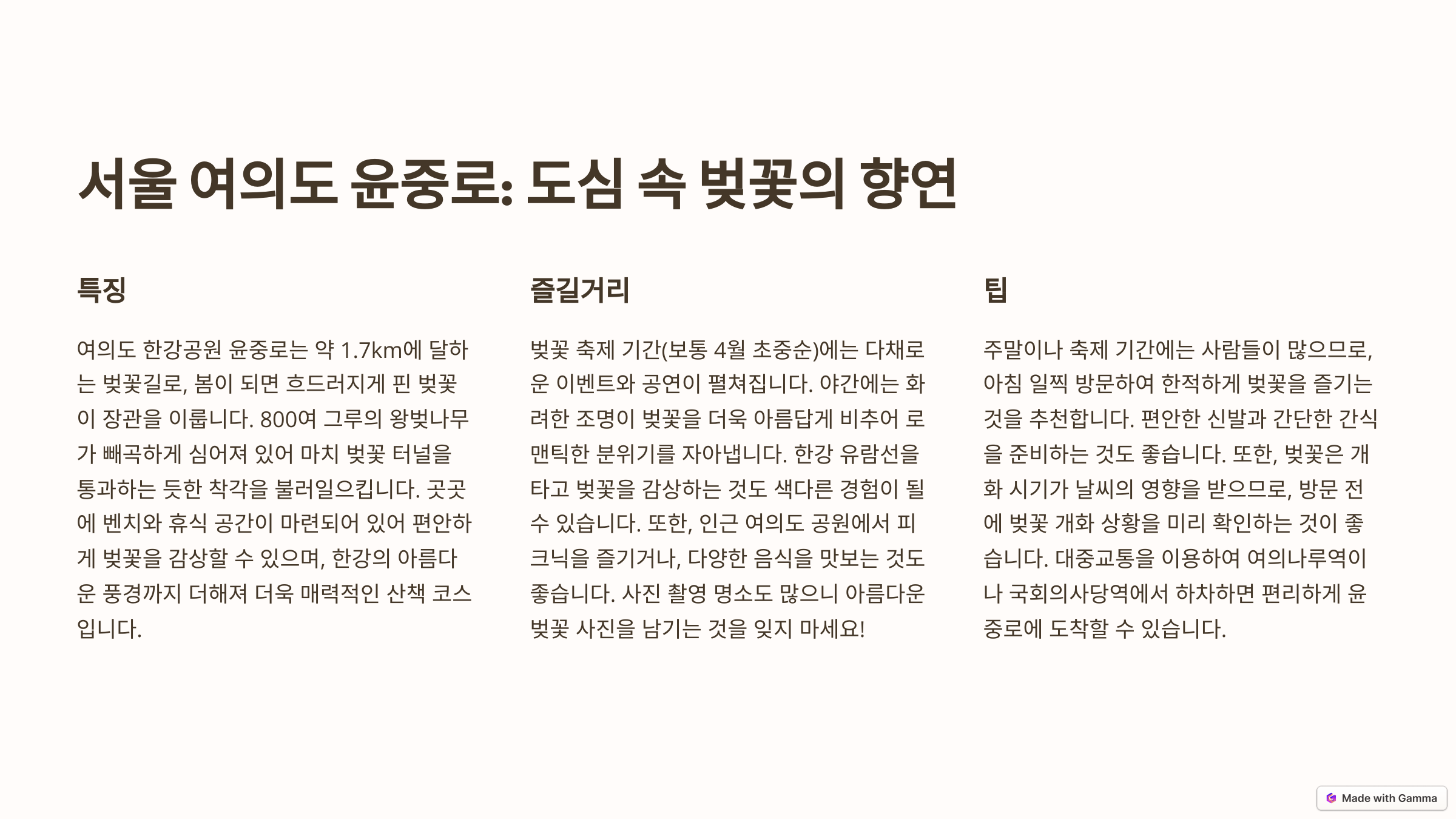 - 특징: 한강변을 따라 약 1.7km에 걸쳐 벚꽃이 만개한 길.