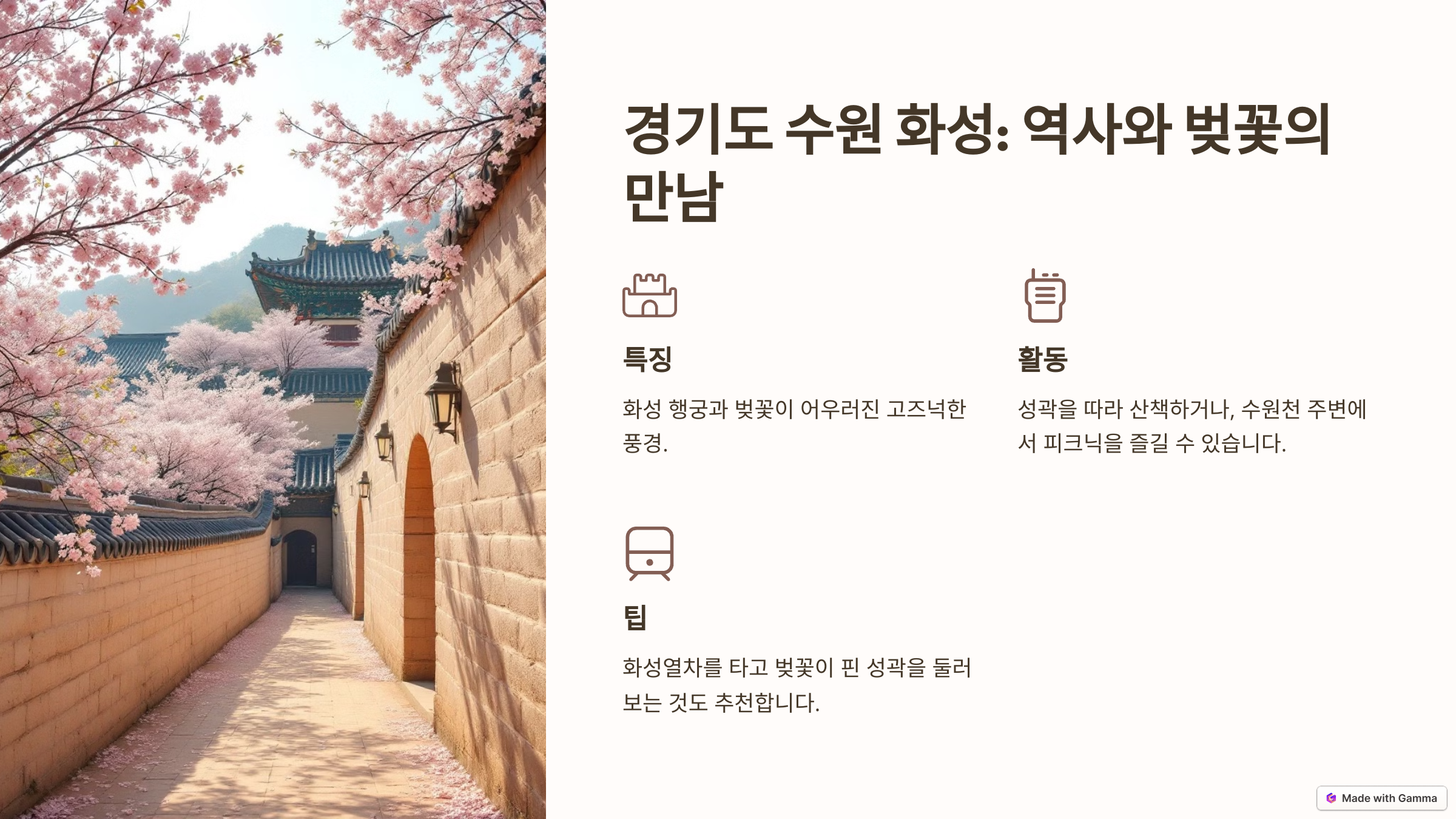 - 팁: 화성열차를 타고 벚꽃이 핀 성곽을 둘러보는 것도 추천합니다.