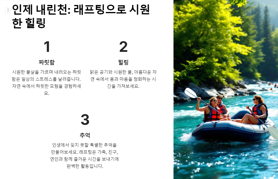 - 인제 내린천: 래프팅을 즐기며 시원한 계곡 물소리와 함께 스트레스를 날려보세요.
