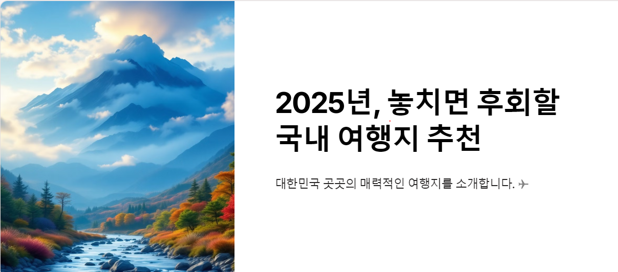 여러분, 2025년의 여행 계획은 세우셨나요? ✈️ 올해는 특별히 국내에서 놓치면 안 될 여행지들을 소개해 드릴게요. 자연의 아름다움, 감성 가득한 도시, 그리고 새로운 핫플레이스까지 한눈에 볼 수 있는 곳들만 모았으니, 이 글을 끝까지 읽고 여행 리스트에 추가해 보세요! 😊